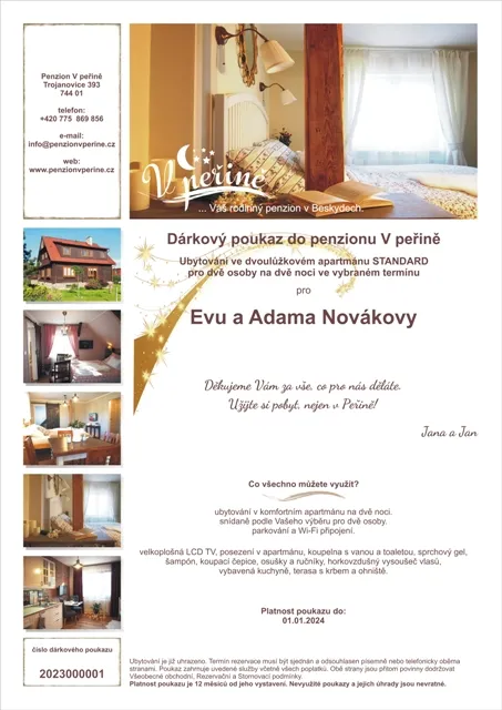 Pro objednávku poukazu nás kontaktujte nejlépe e-mailem na adrese info@penzionvperine.cz. Proběhne krátká komunikace, ve které si vzájemně odsouhlasíme rozsah služeb.
